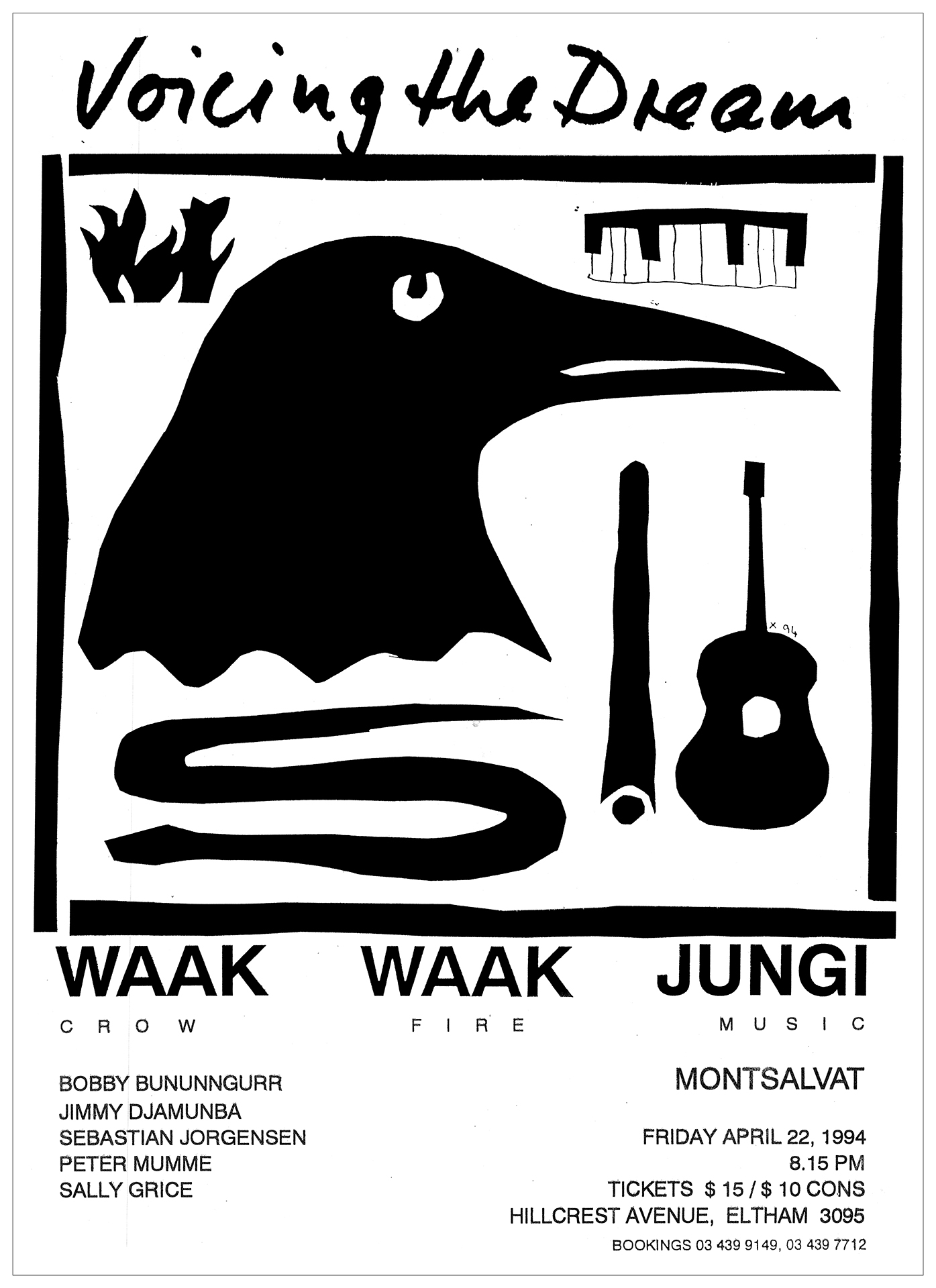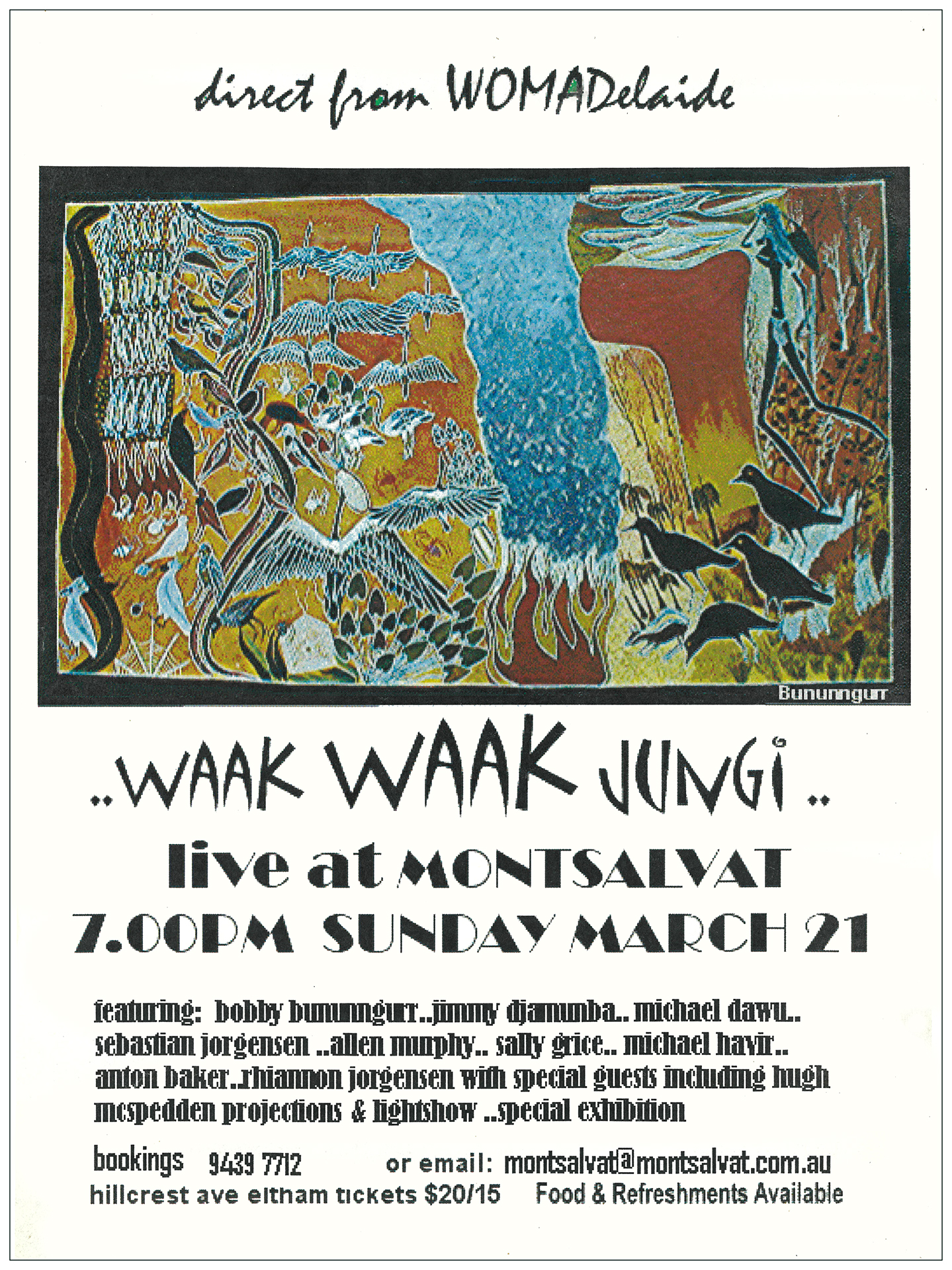 Waak Waak Jungi – direct from Womadelaide – live at Montsalvat – Bobby Bunnungurr / offset press / A3 poster – 2004