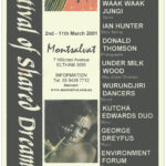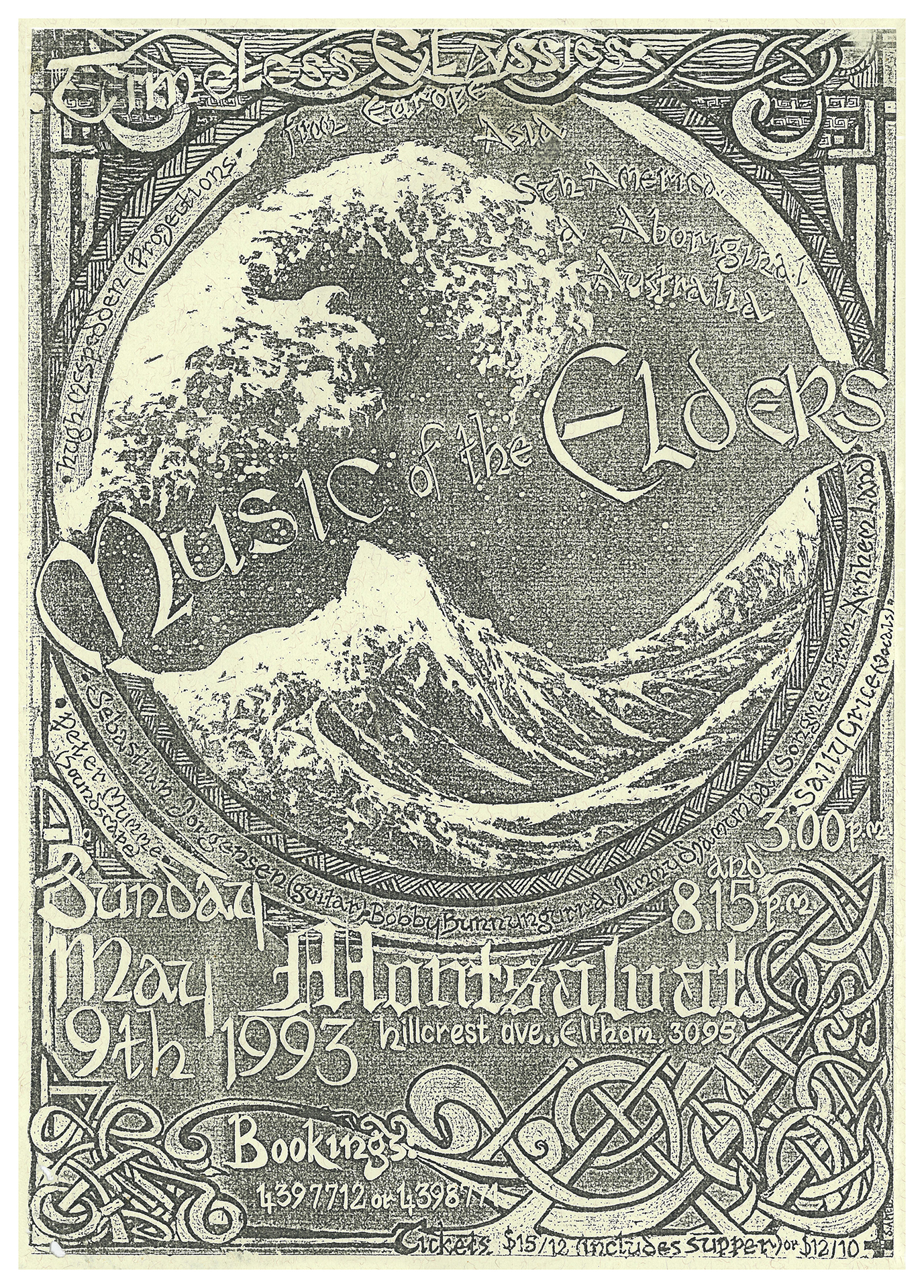 Music of The Elders – featuring Sebastian Jorgensen (guitar), Peter Mumme (keyboards) and Sally Grice (vocals) with Arnhem Land songmen Bobby Bunnungurr and Jimmy Djamunba – Sue Apted / Offset Press / A4 Handbill – 1993