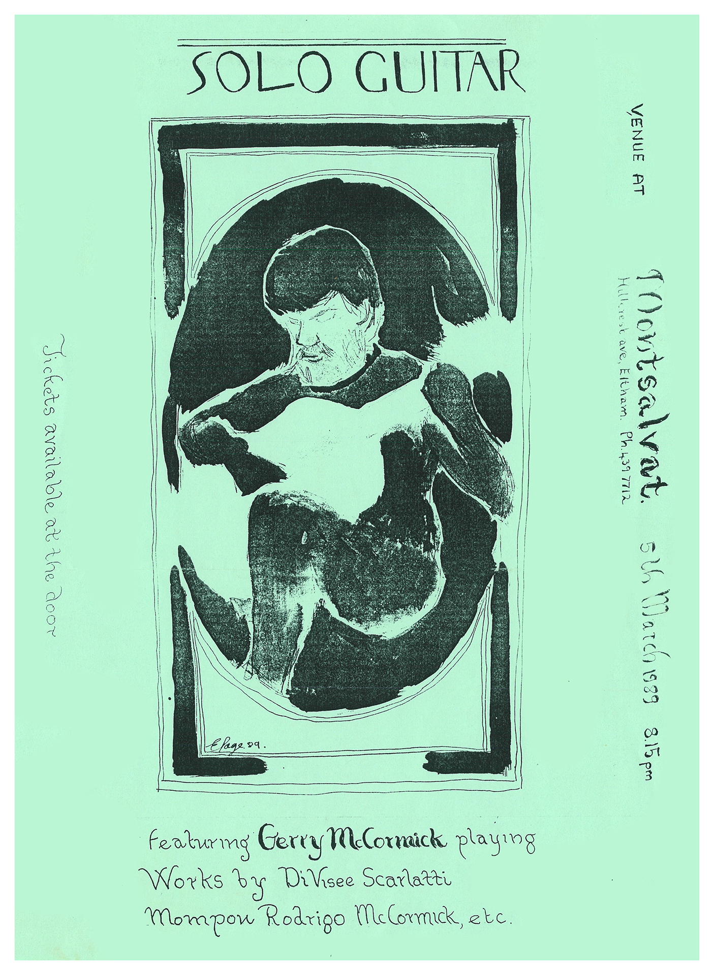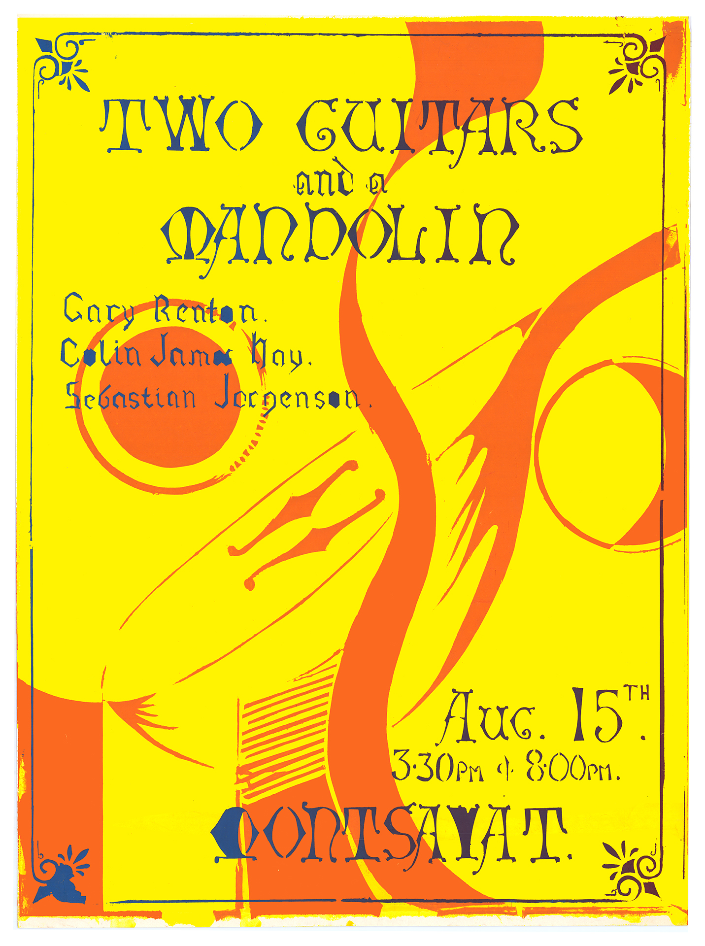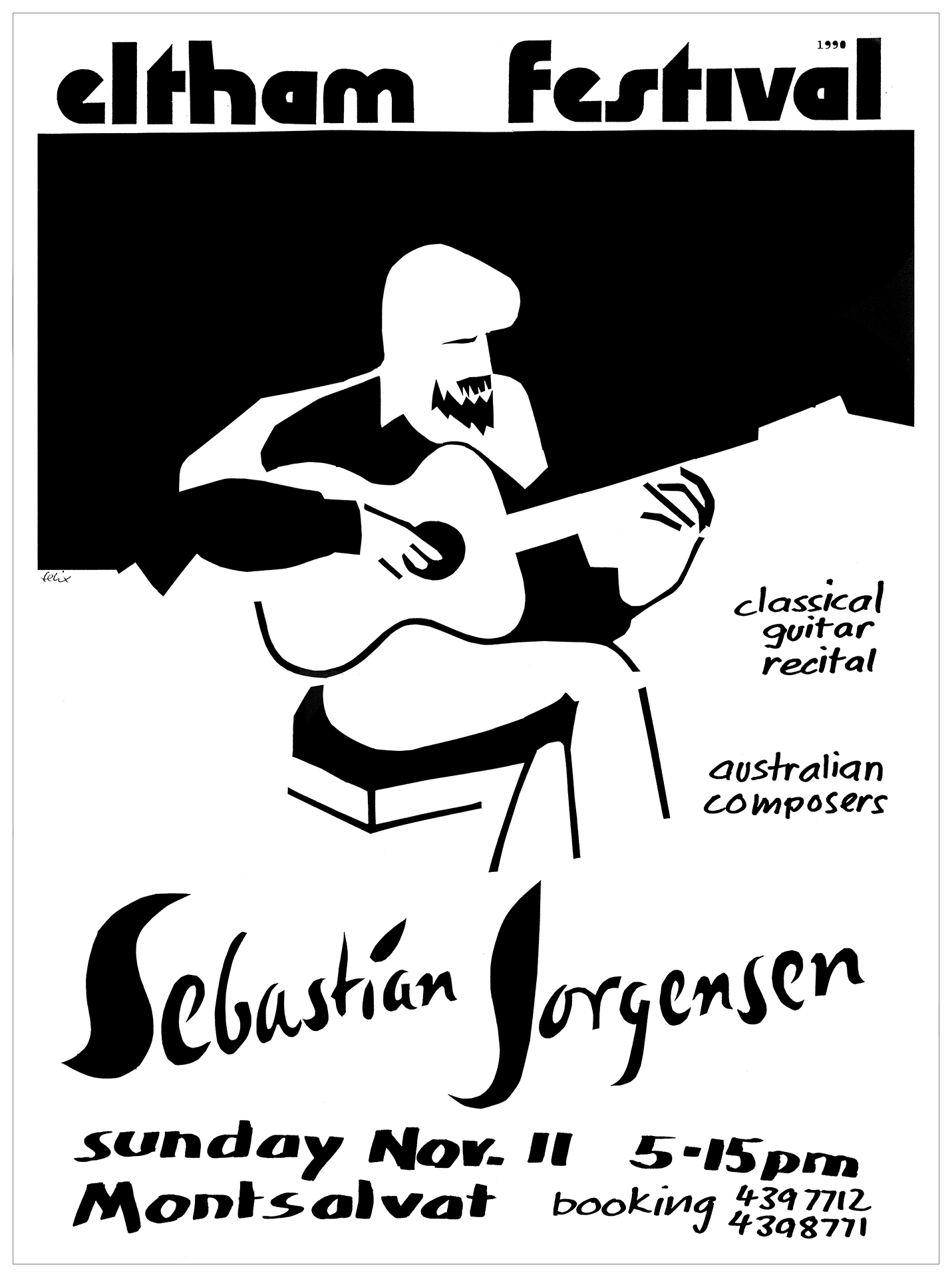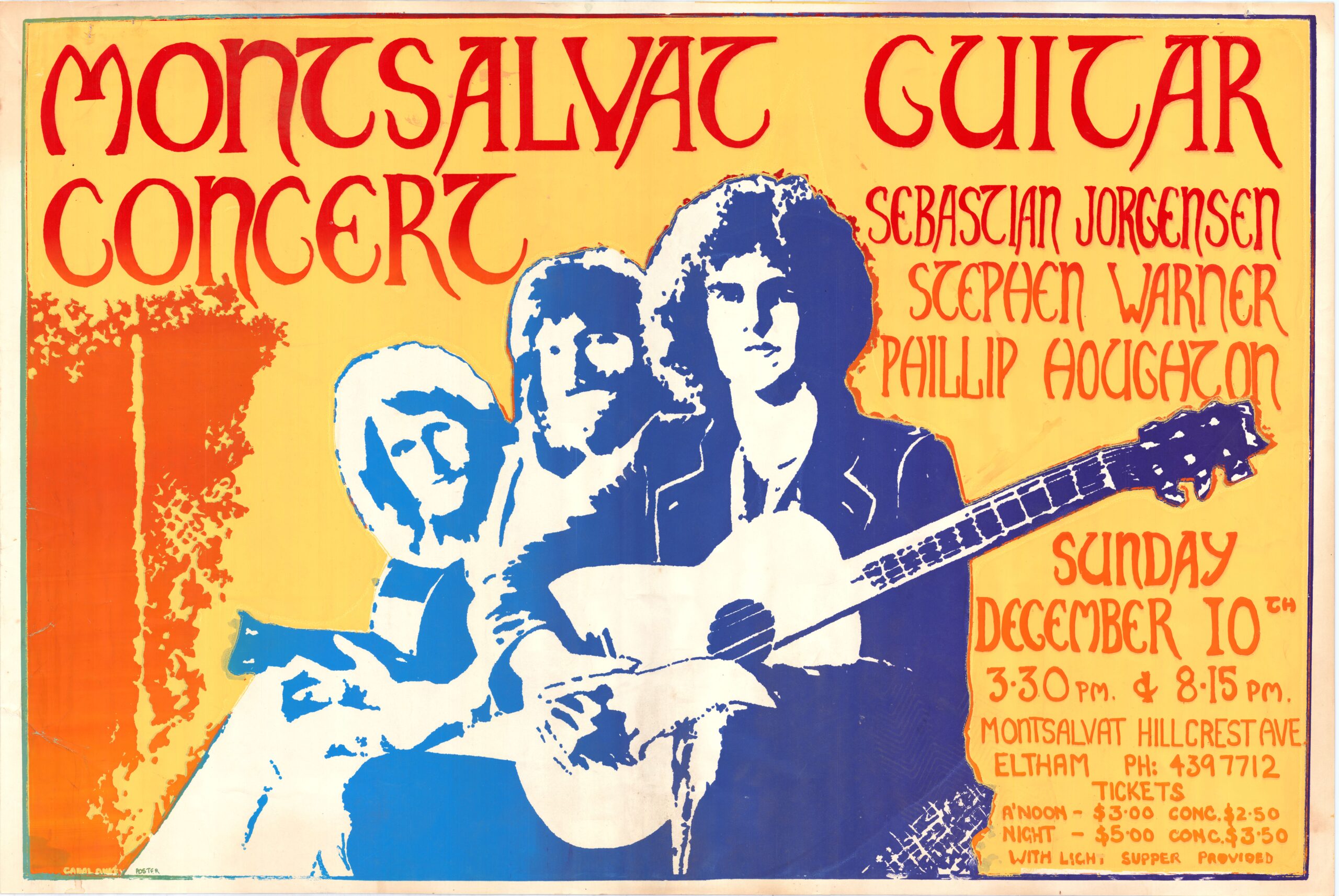From 1974, Sebastian regularly contributed solo guitar concerts to Montsalvat’s annual programs of musical events. From 1978, Sebastian started to curate concerts at Montsalvat that included other guitar or string instrument players. Artist Carol Onley, a resident of the Montsalvat Christmas Hills Farm, produced large, colourful screen print posters for these events. These posters continued to reference the classic, gothic typeface consistent with other Montsalvat events, but were larger and more impactful and experimental in design.