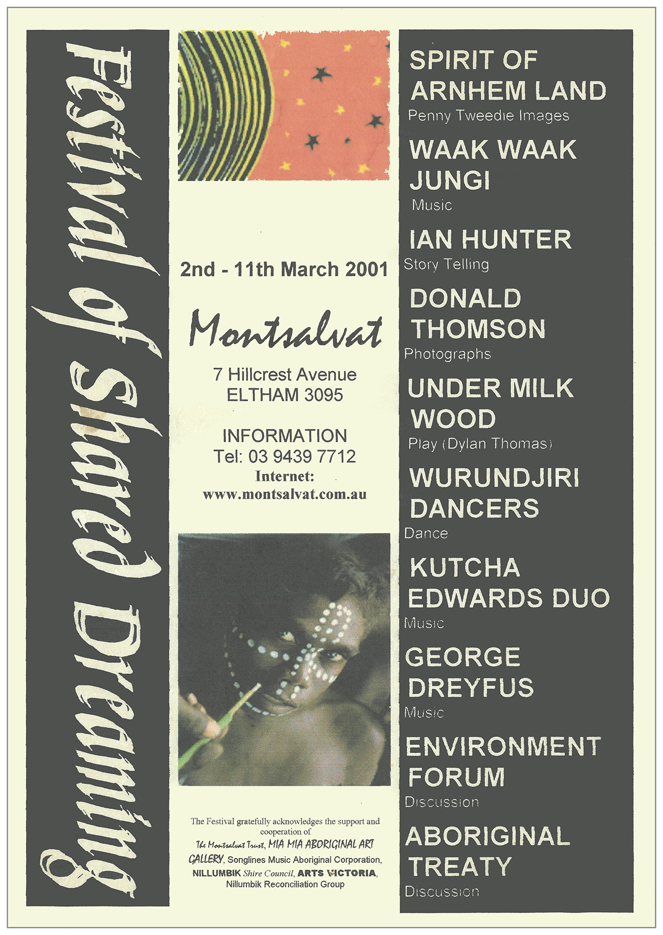 Festival of Shared Dreaming at Montsalvat 2001 – Artwork by Donna Brown / Photograph by Penny Tweedie Offset Press / A3 poster