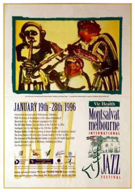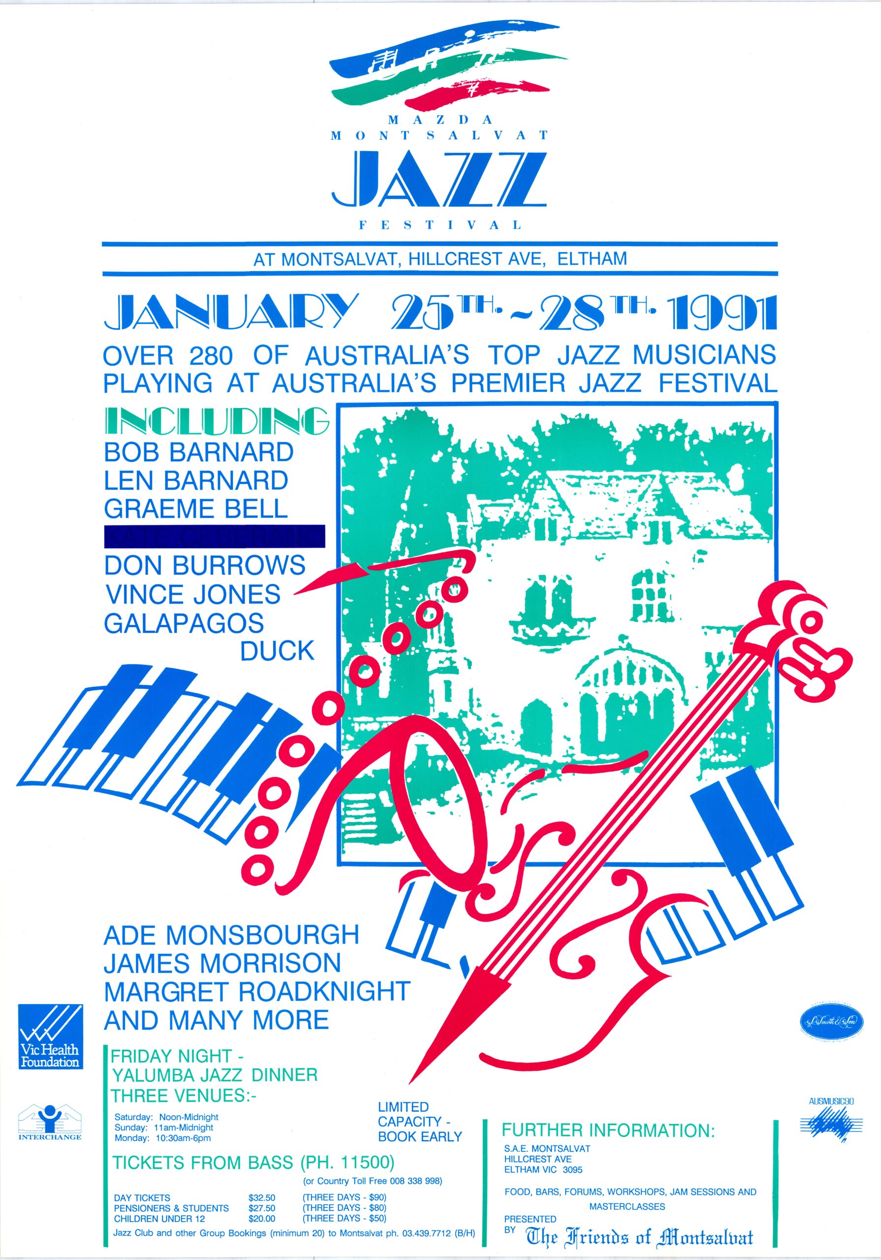 Later to be known as the Montsalvat Melbourne International Jazz Festival, ran in January each year, for nine years from 1988-1996. It was founded by Sigmund Jorgensen and had several prominent Australian jazz identities as artistic directors; Allan Leake (1988-93), Bob Sedergreen (1994-5) and Ted Vining (1996).