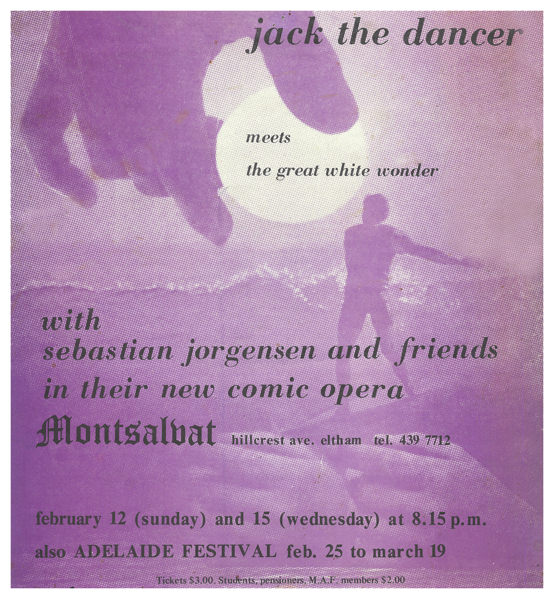 The 5th and final production in the 5-series of music-theatre performances devised by Sebastian Jorgensen for Montsalvat was ‘Jack the Dancer’. Presented in February of either 1977 or 1978 at Montsalvat, it was performed next month in Adelaide as part of the Adelaide Festival ‘Fringe’.