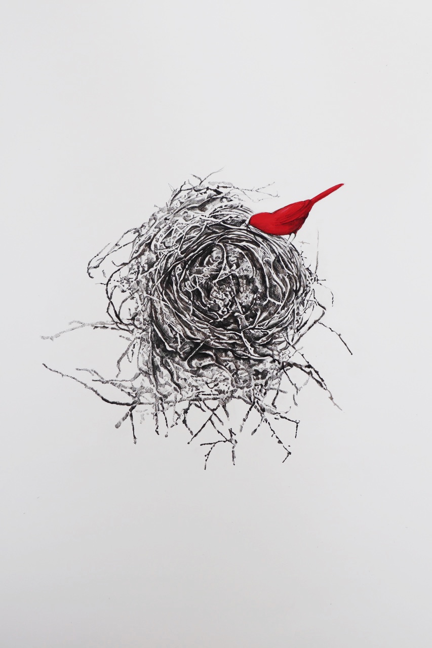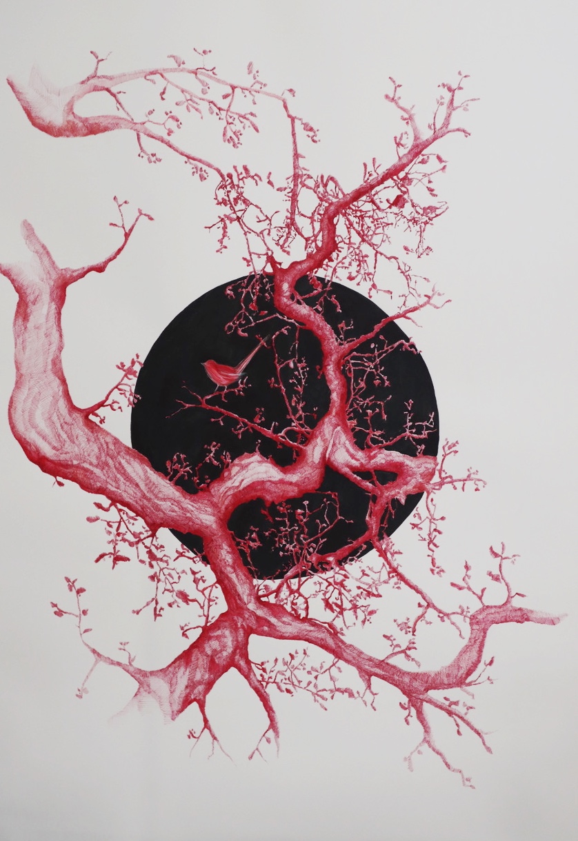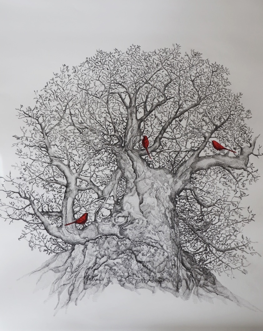 In the body of work, Tasmina draws on birds and elements of nature, such as trees and stones, as central metaphors for transformation, continuity, and the weight of memory and emotion we carry. Birds, in their instinctive movement across skies and seasons, echo the rhythms of migration. Their journeys are fluid and uncertain, yet guided by an inner sense of direction. Alongside this, the natural forms of trees reflect the ever-changing nature of life and the ways we evolve through its many phases.