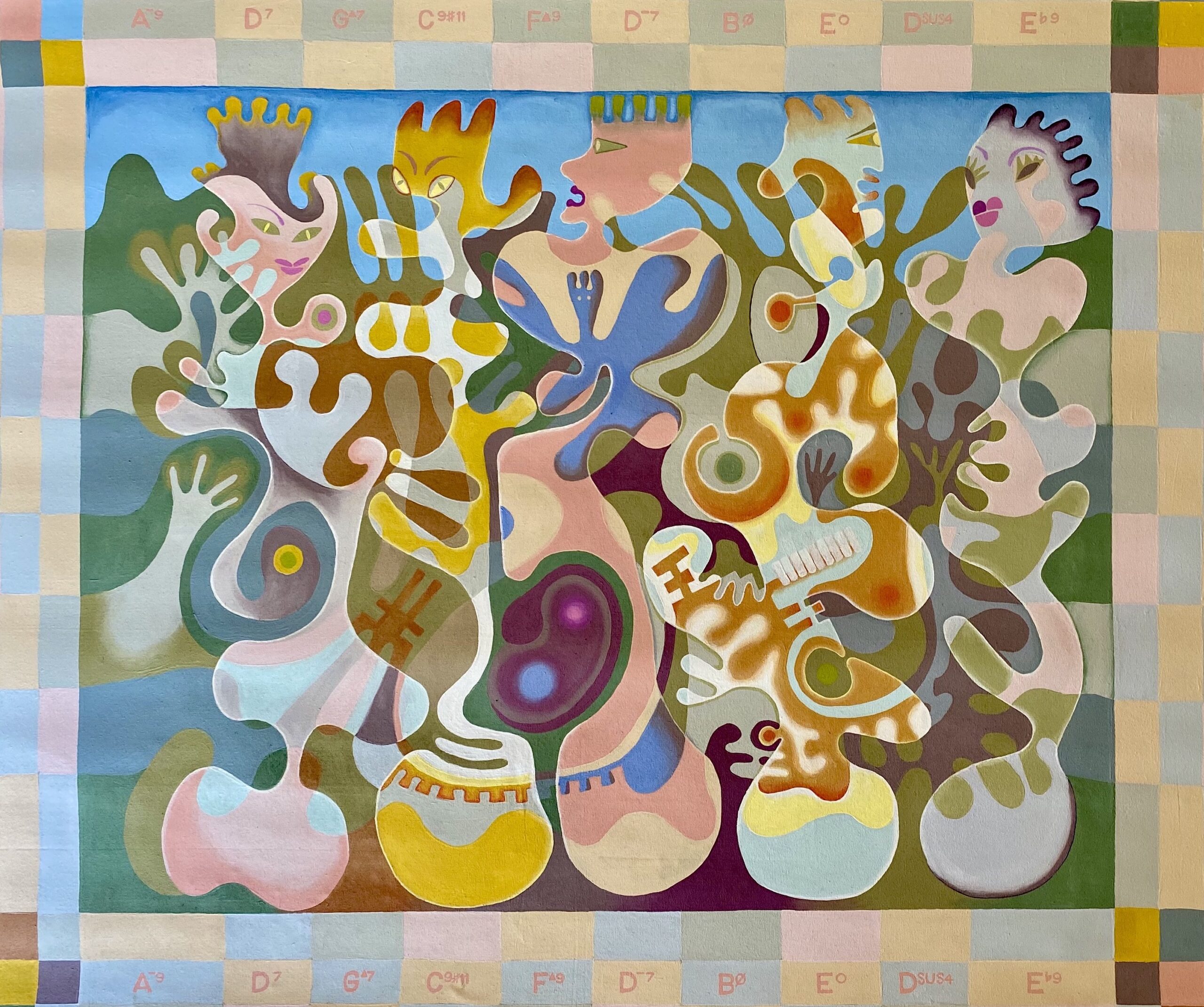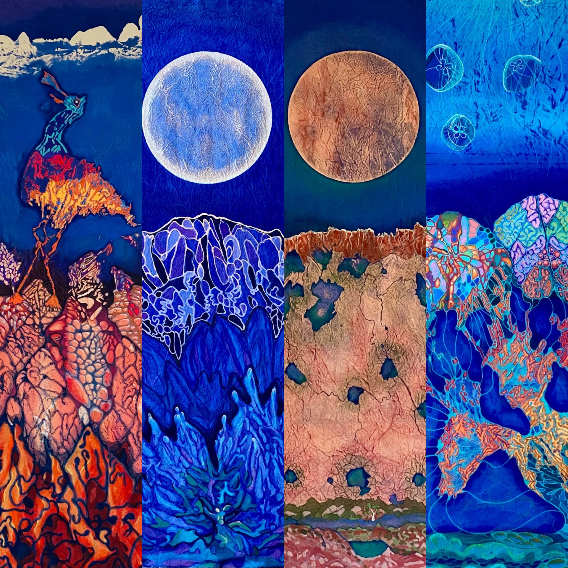 For her current exhibition she has composed a song inspired by the key painting “Resonant World” (pictured above) which will be perfomed at the opening event by female vocal ensemble The Songstresses, accompanied by chimes and harp. Other paintings will also have companion pieces performed.